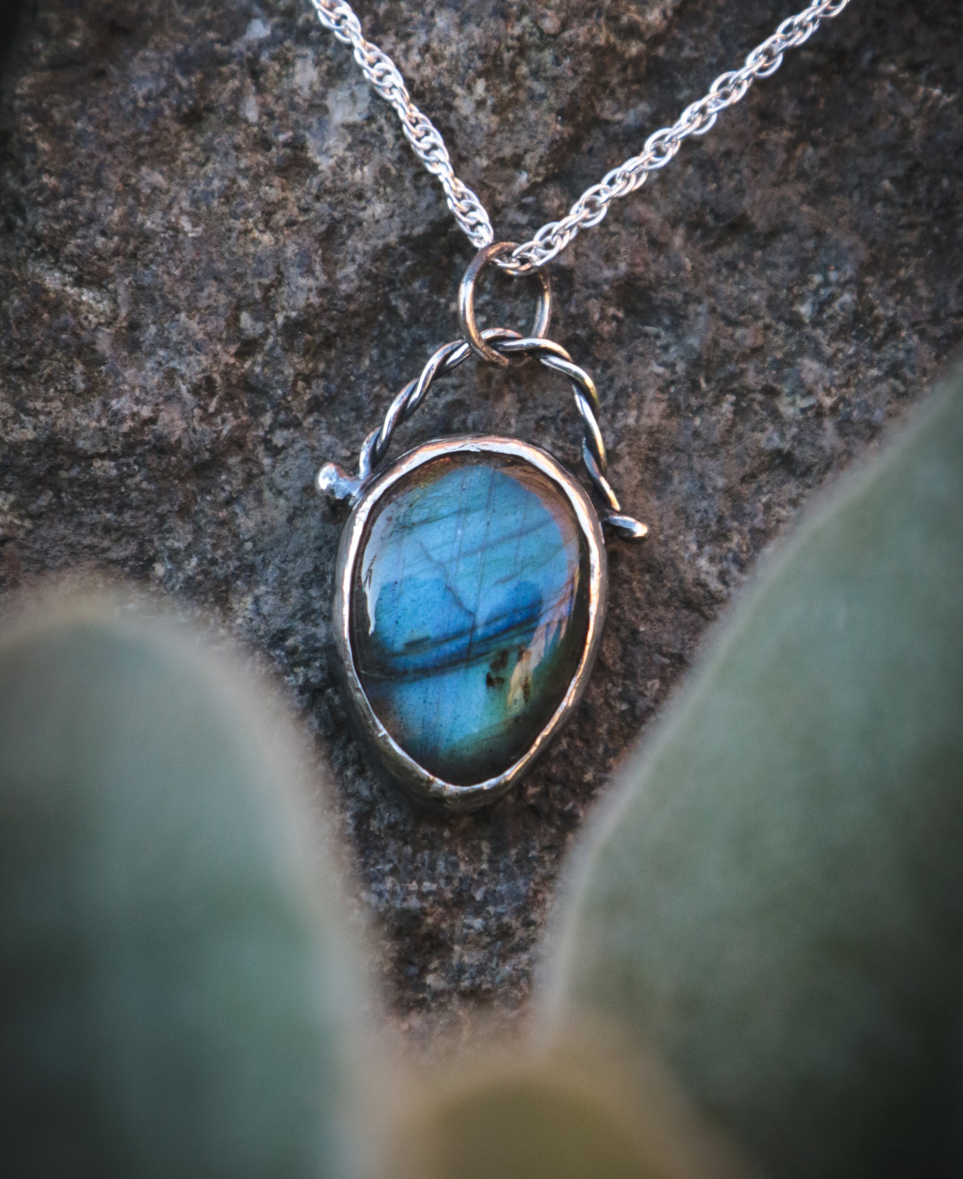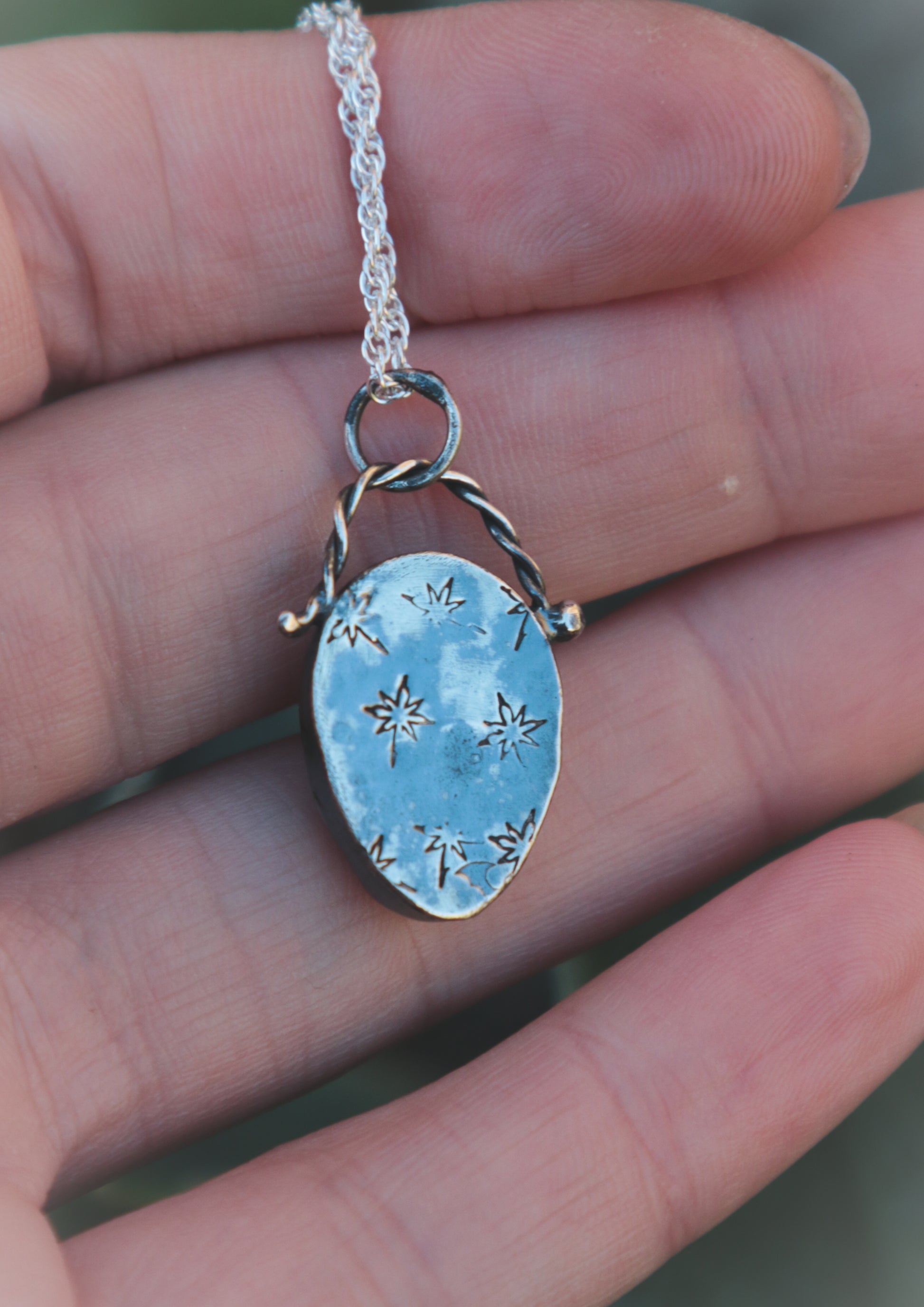 A sterling silver necklace with a oval flashy blue Labradorite and stars on the back.