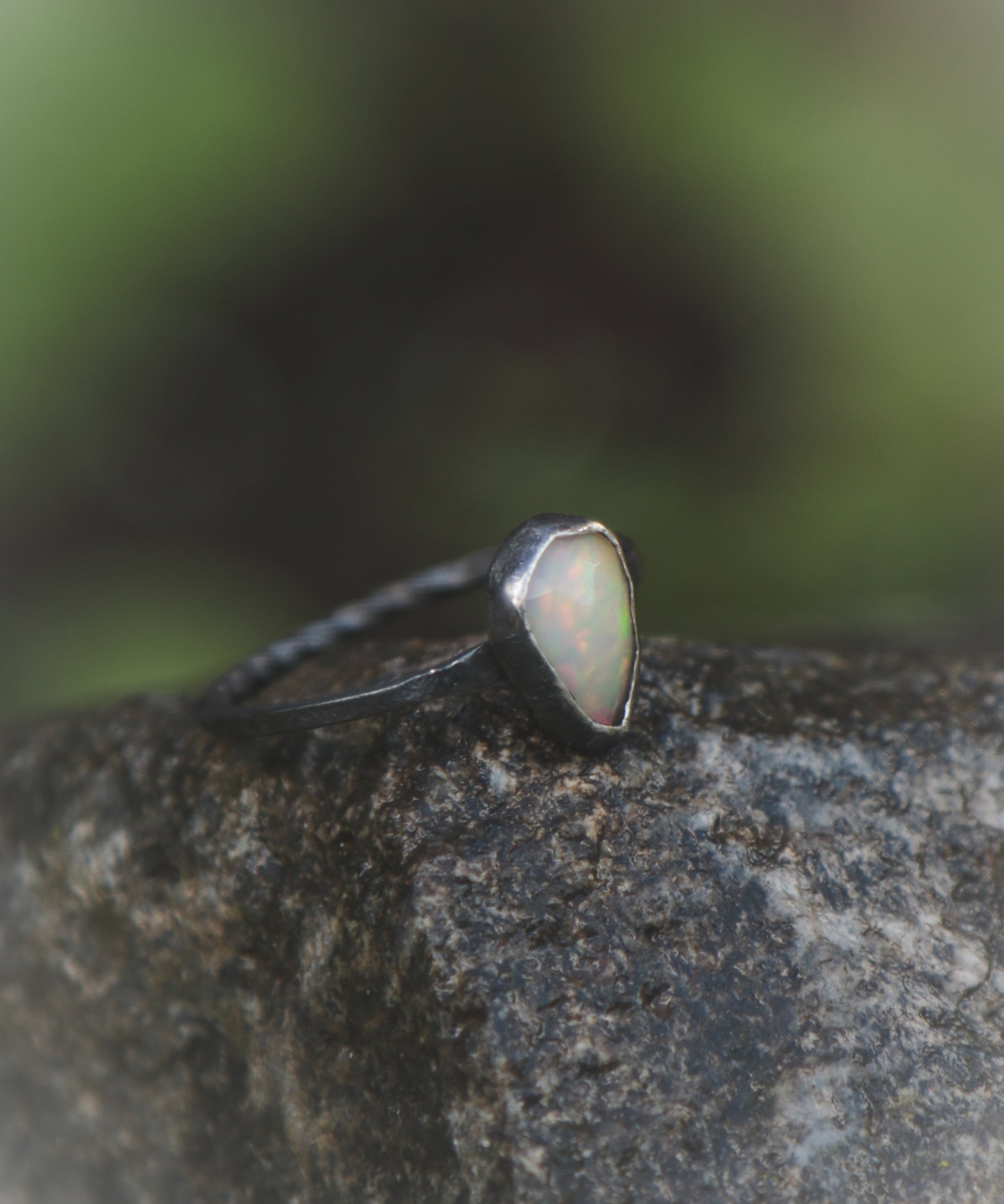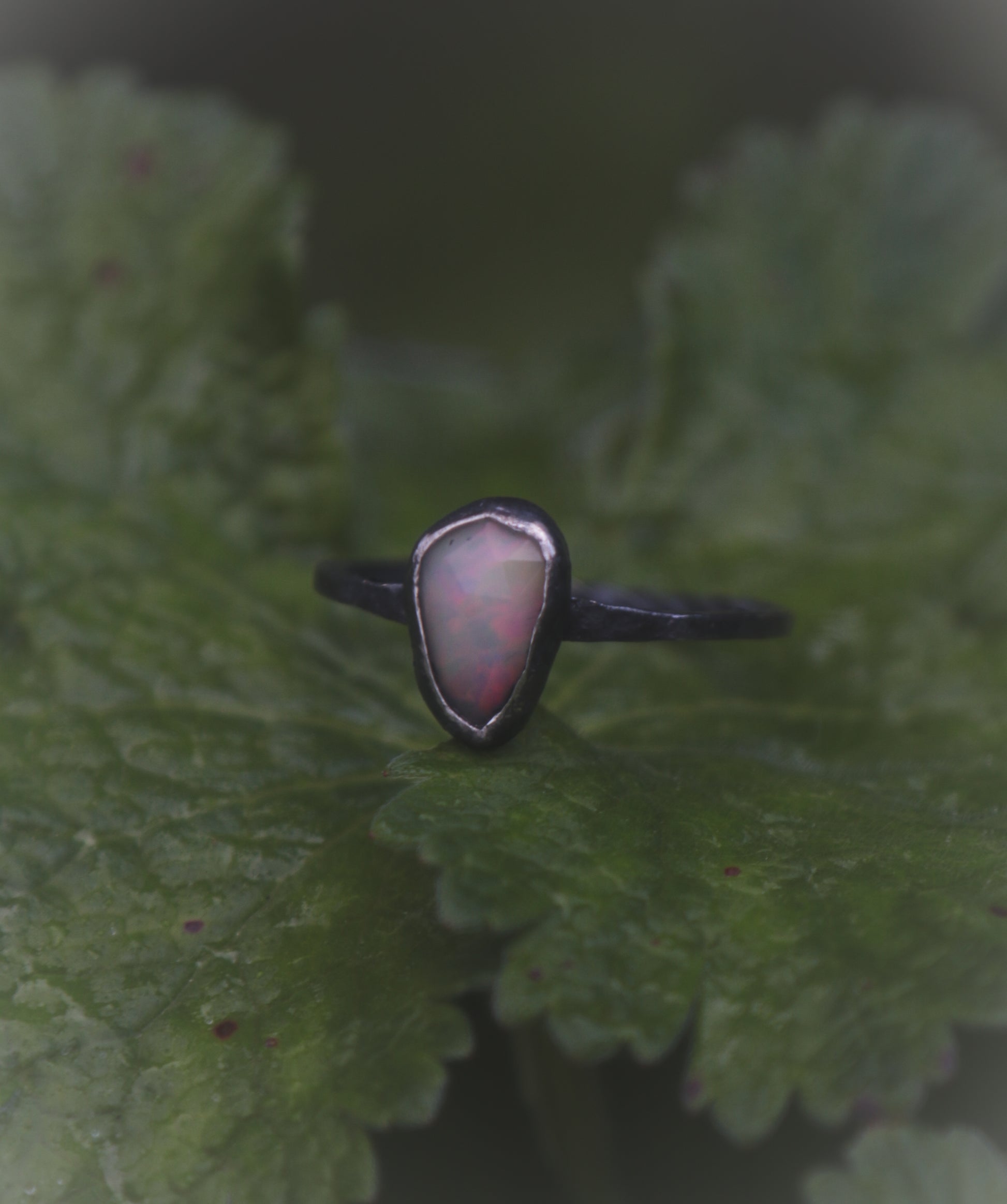 A sterling silver ring, with a beautiful rose cut changing Opal. What I mean is that the Opal is not stabilized so it changes depending on environmental factors. Usually it seems sunlight and moisture are main causes. When I made this ring and photographed it, the stone was more of a white colour with a deep smoldering pink and a touch of greens and blues. However as I write this the stone is now gone translucent and is firing really vivid reds and greens, really quite different to how it was a hour ago. Personally I love a changing stone, but please be aware if you are thinking of buying this ring, the stone changes.