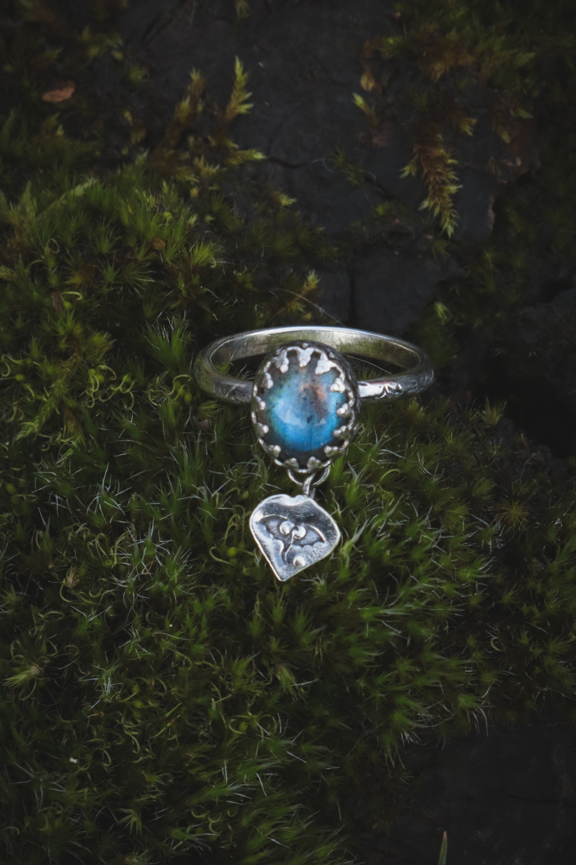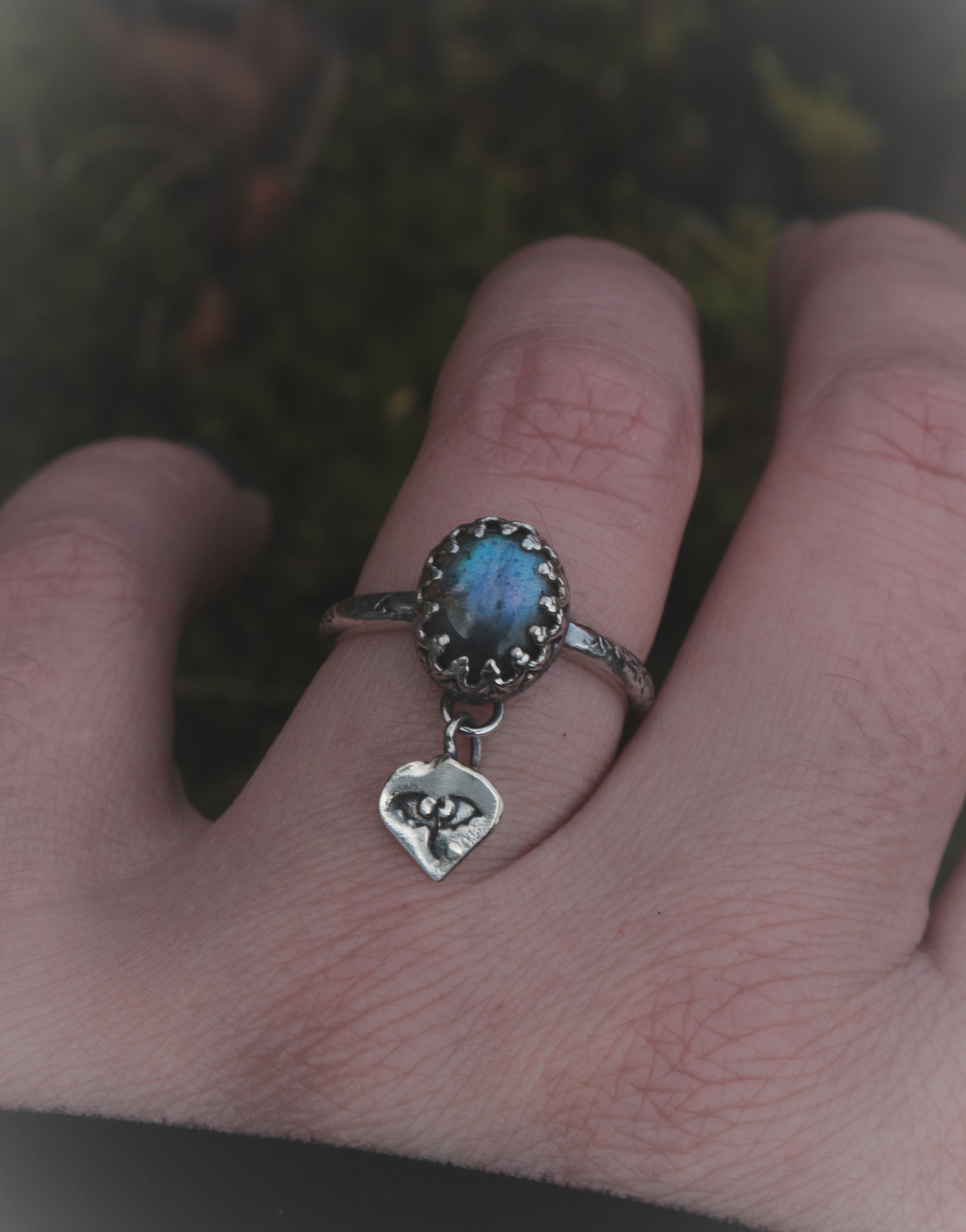 A sterling silver ring with a rich blue labradorite and a dangly bit with a Dragon.