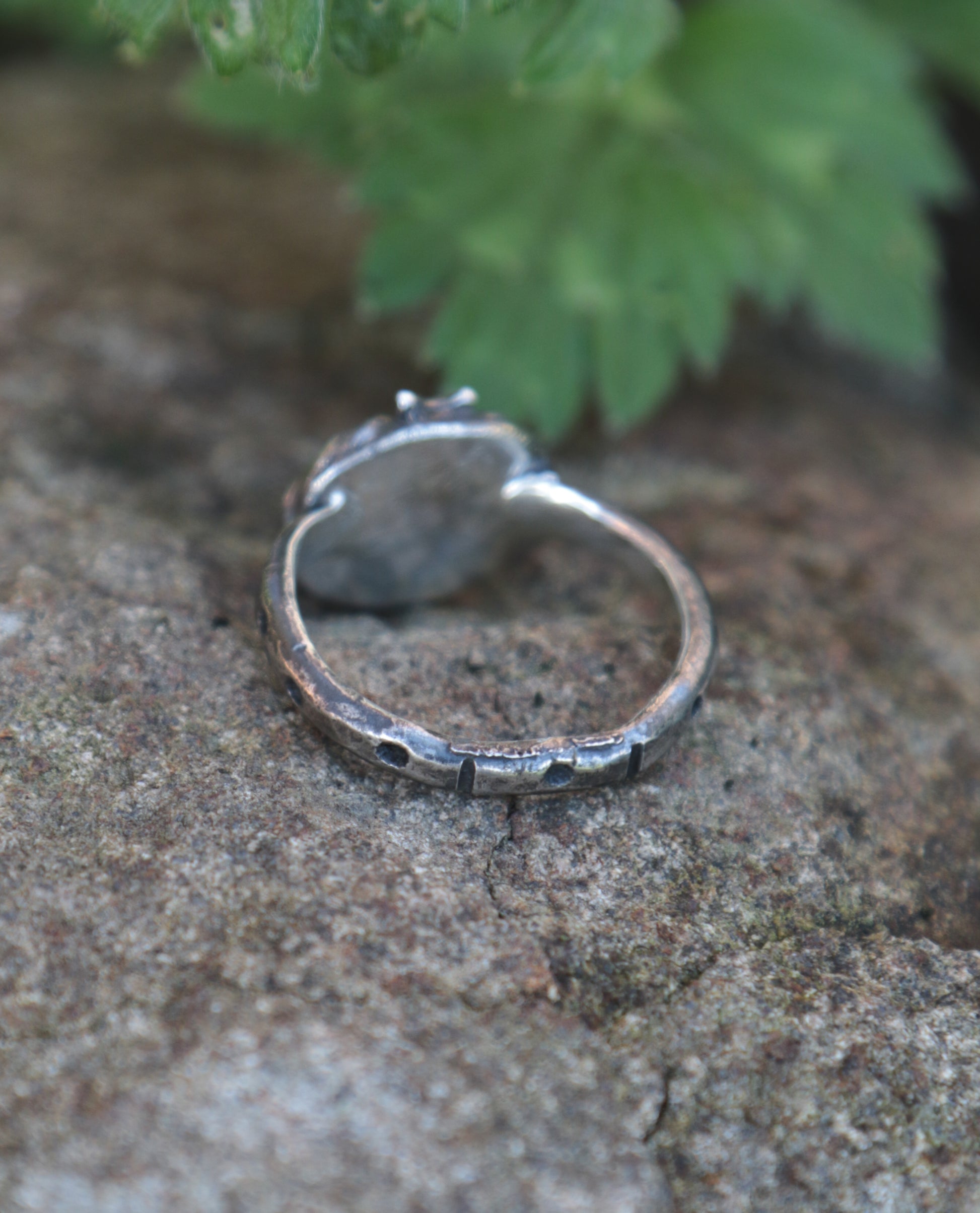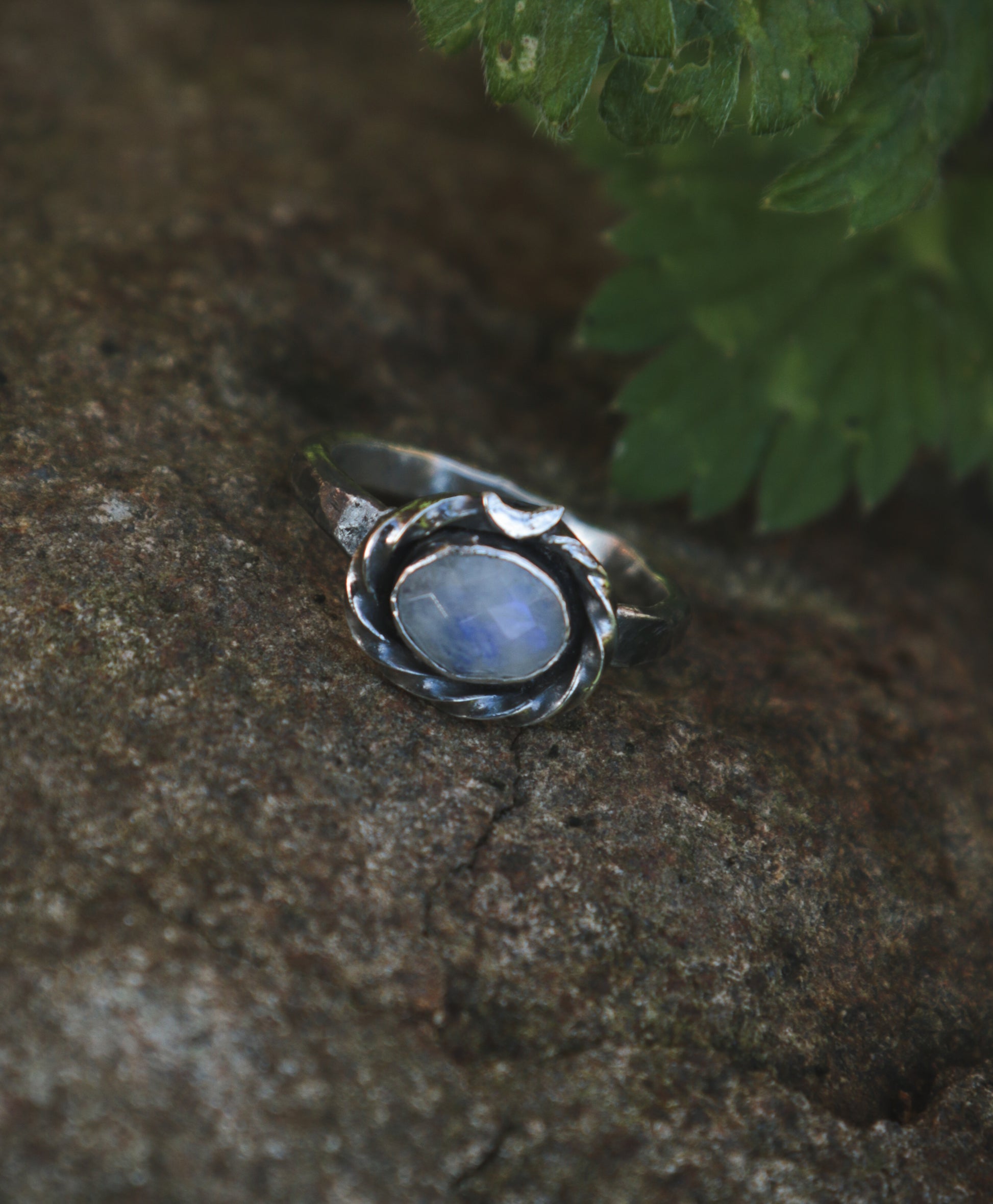 A sterling silver ring with a lovely rose cut rainbow Moonstone.