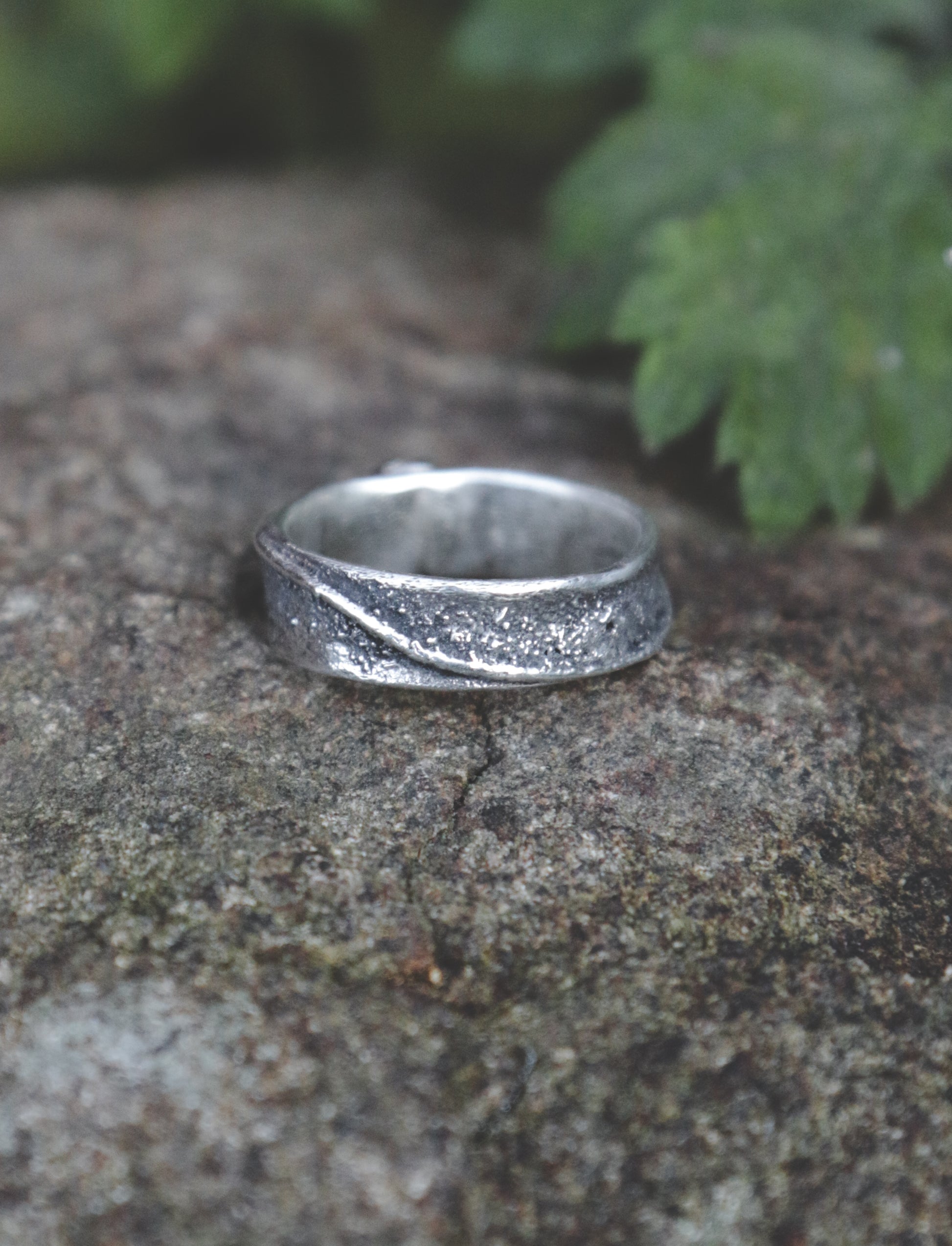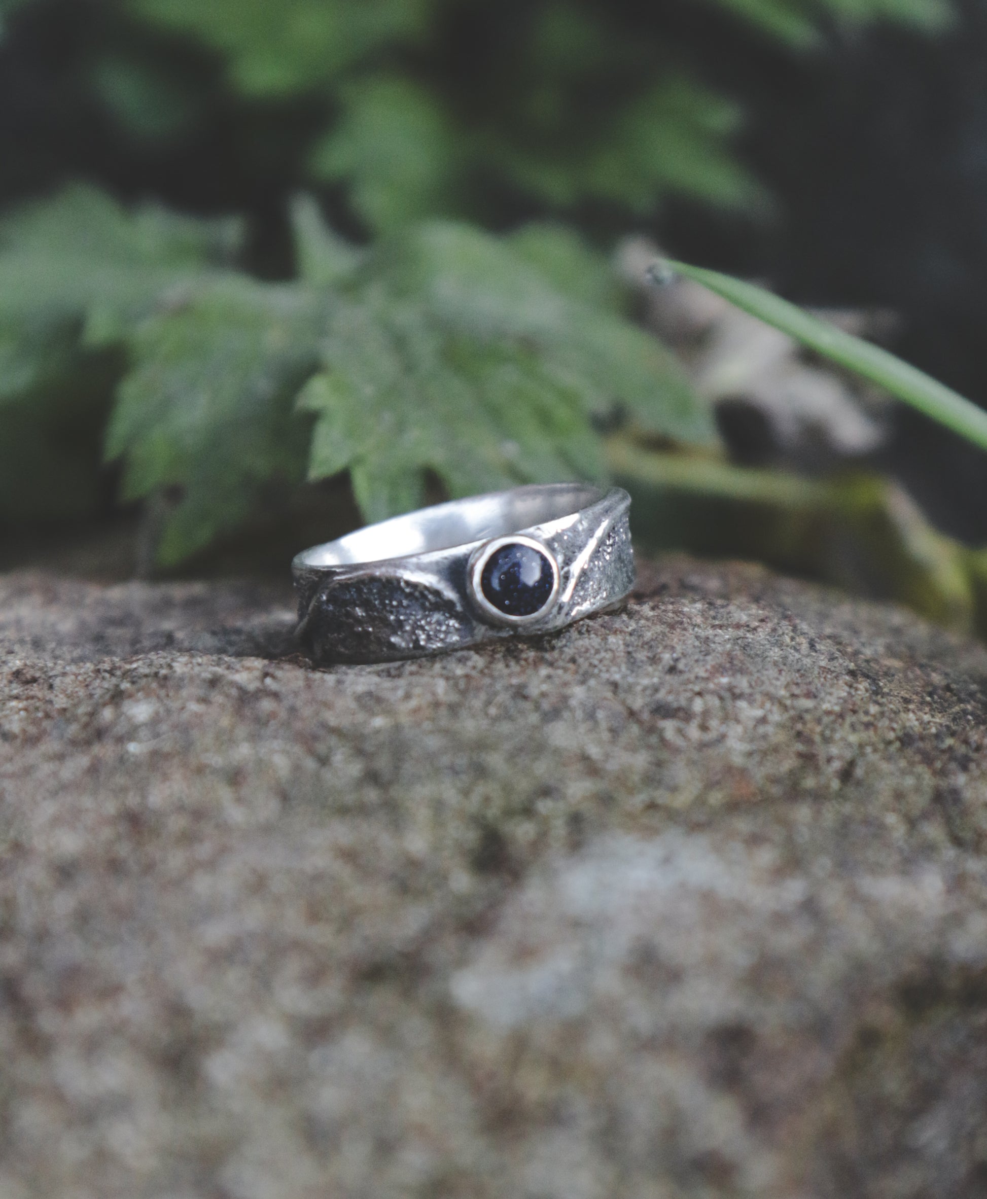 A rustic sterling silver ring with a 5mm Blue Goldstone.